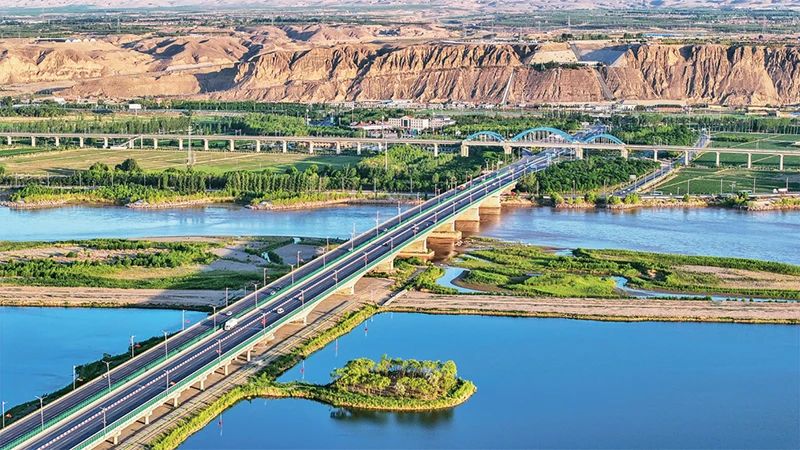 新時代生態文明建設的成就舉世矚目,成為新時代黨和國家事業取得歷史性成就、發生歷史性變革的顯著標志。圖為2023年6月13日,位于寧夏中衛的黃河公路大橋、黃河鐵路大橋與黃河濕地交相輝映,美麗如畫。人民圖片 柴更利/攝