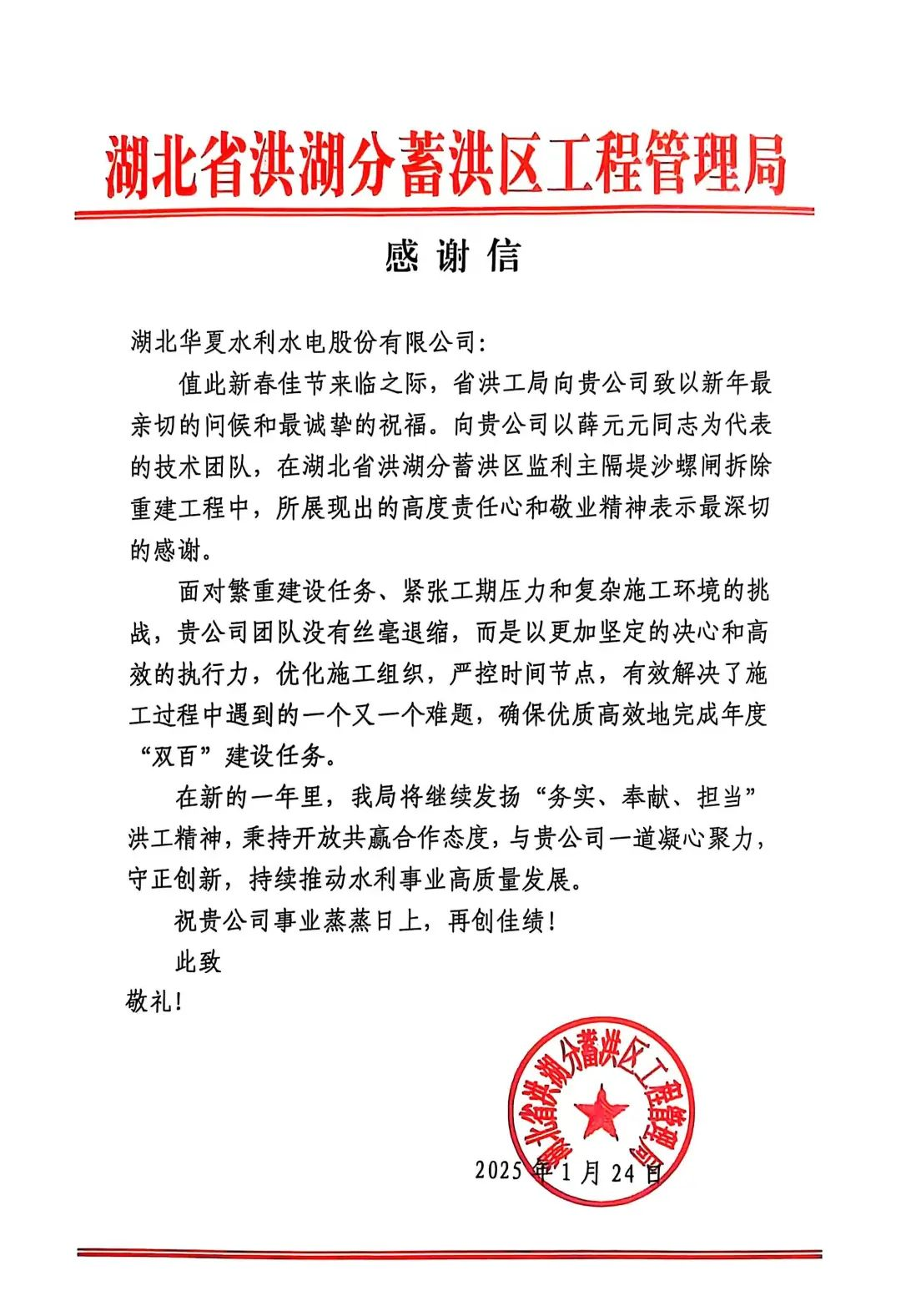 湖北華夏水利建設的沙螺閘拆除重建工程自開工以來,項目部堅持以強烈的使命感推動工程建設,以高度的責任心踐行國企擔當。圓滿完成了沙螺閘拆除重建項目年度“雙百”建設任務,獲湖北省洪湖分蓄洪區工程管理局感謝信。
