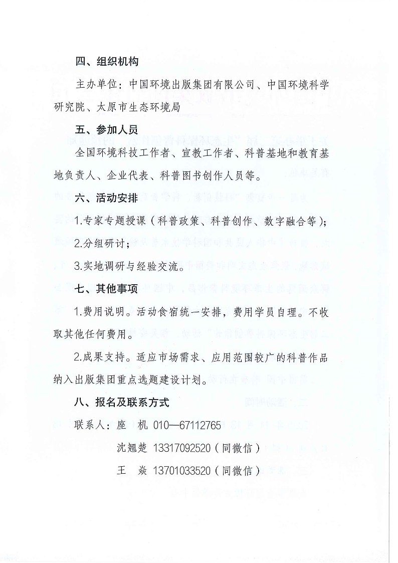 為進一步貫徹“科技創新、科學普及是實現創新發展的兩翼,要把科學普及放在與科技創新同等重要的位置”的要求,推動《中華人民共和國科學技術普及法》在生態環境領域落地,聚焦生態文明和美麗中國建設,產出更多市場認可、群眾滿意的生態環境科普作品,中國環境出版集團有限公司、中國環境科學研究院、太原市生態環境局聯合舉辦“第二屆生態環保科普創作營”活動,相關安排如下。